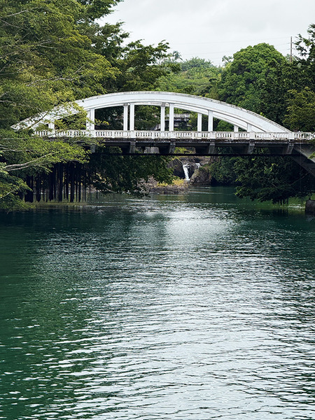 レインボーフォールから帰ってきて、ワイルク川がヒロ湾に流れ込む河口付近です。カメハメハアベニューのワイルク橋から見た白いプウエオ橋です。ヒロ···
