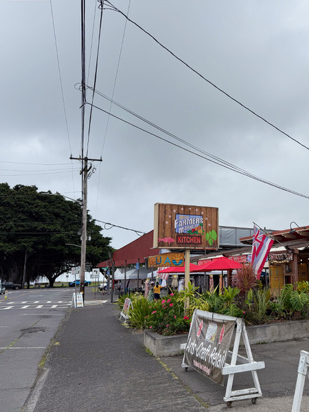 ヒロの街のファーマーズマーケットにやってきました。もう9時くらいなんですが・・・曇り空がとっても重たいです。ファーマーズマーケットのフードコ···